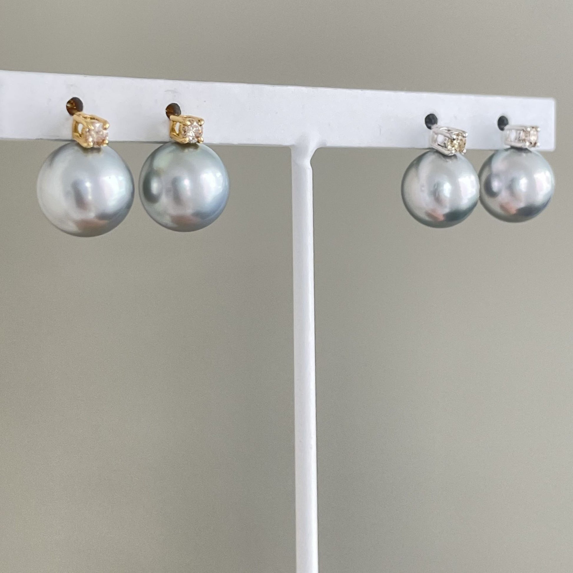 美しいブルーグレーの黒蝶パールとダイヤモンドを組み合わせたピアスです。K18イエローゴールドまたはK18ホワイトゴールドからお選びいただけます。