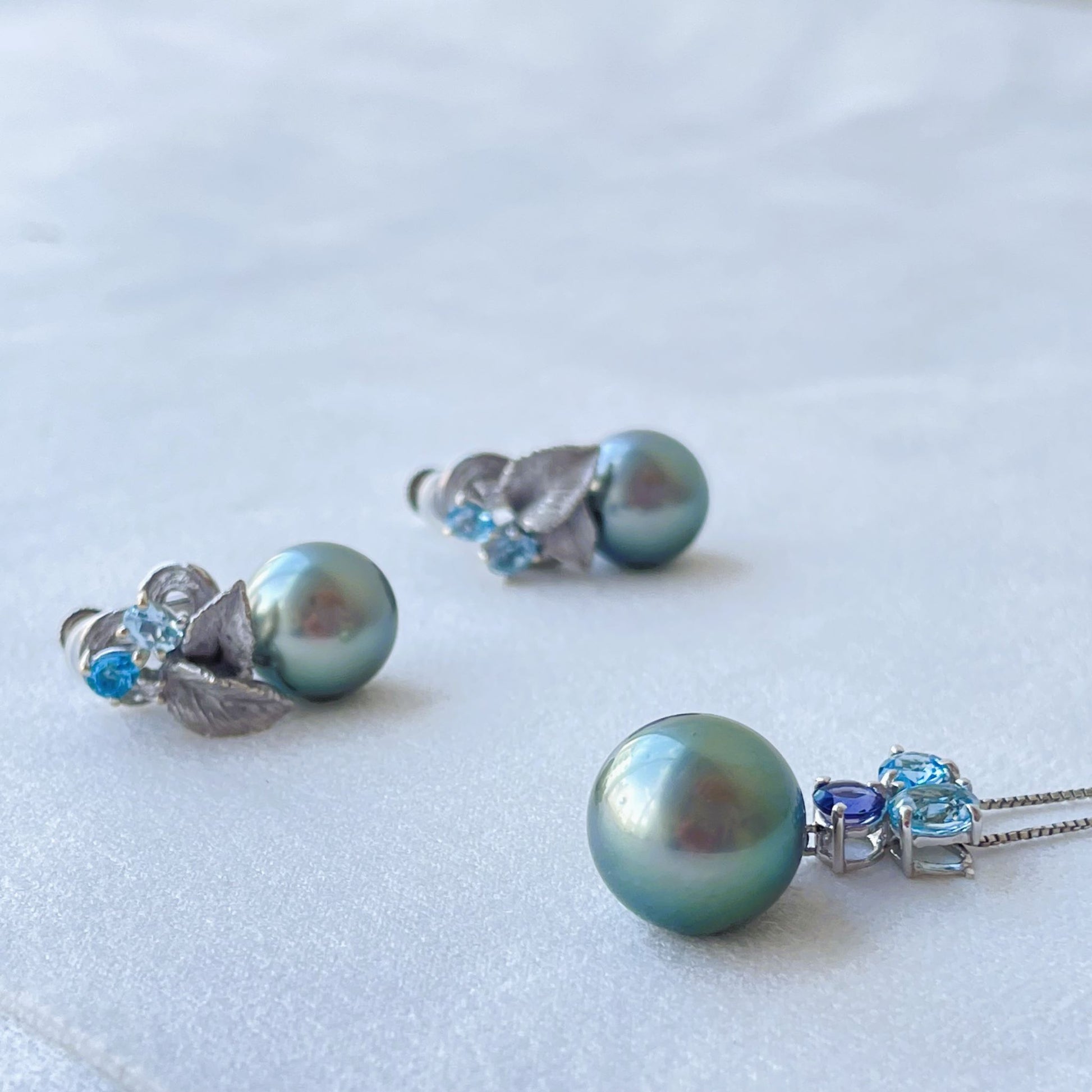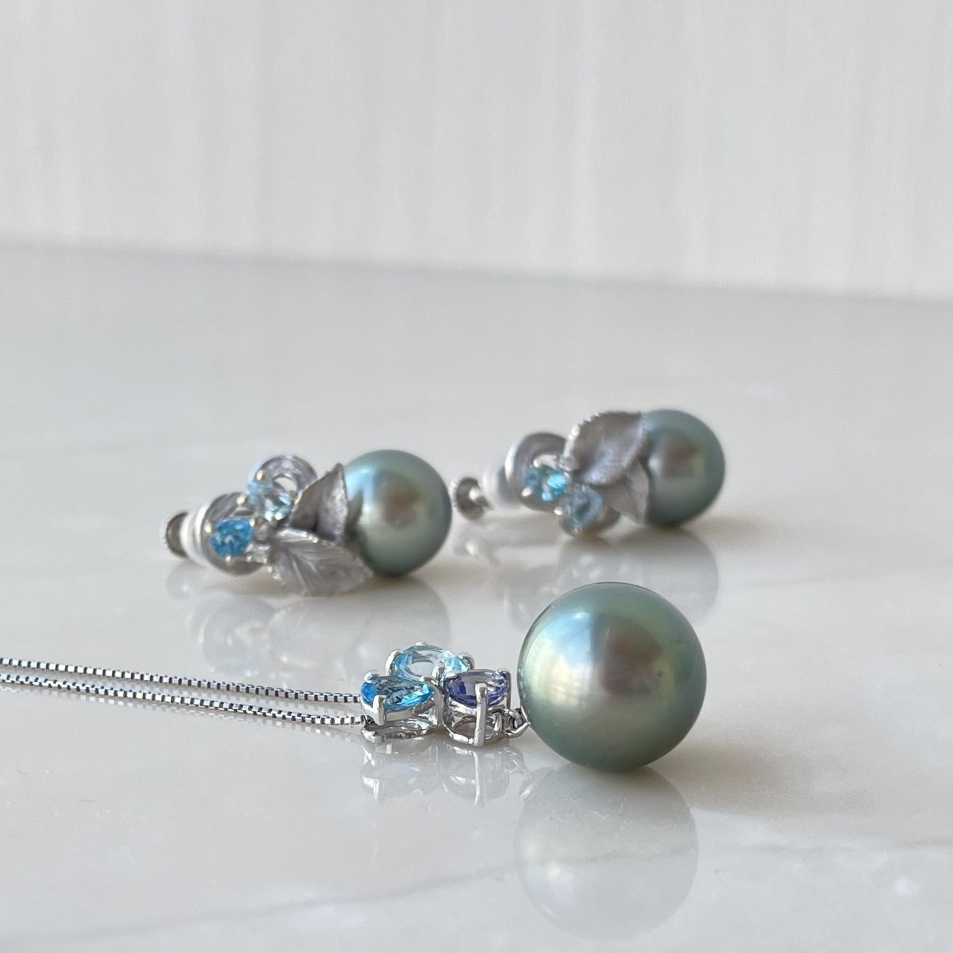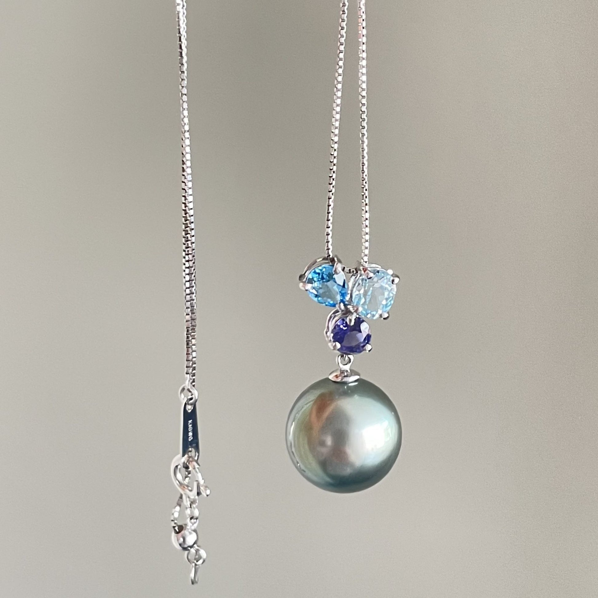 タヒチ産ブラックパールと、きらめくブルートパーズのコントラストが美しいペンダント。洗練されたデザインは、どんな装いにもさりげなく上品さをプラスしてくれます。
